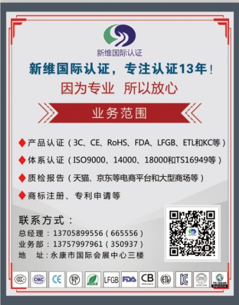 新維國(guó)際認(rèn)證位于浙江永康市會(huì)展中心六樓,經(jīng)歷十五年風(fēng)風(fēng)雨雨,匯集成本地產(chǎn)品認(rèn)證、體系認(rèn)證和企業(yè)管理咨詢(xún)培訓(xùn)較大和較有實(shí)力的公司之一,業(yè)務(wù)范圍已經(jīng)擴(kuò)展到全省,甚至到全國(guó);公司擁有非常專(zhuān)業(yè)的認(rèn)證專(zhuān)員、有實(shí)戰(zhàn)經(jīng)驗(yàn)和專(zhuān)業(yè)的管理培訓(xùn)教練,公司擁有自己的檢測(cè)設(shè)備,方便產(chǎn)品預(yù)檢測(cè)。我們與德國(guó)TUV、瑞士SGS、英國(guó)ITS、法國(guó)BV、美國(guó)UL、中國(guó)質(zhì)量認(rèn)證中心、中國(guó)中檢集團(tuán)、中國(guó)家用電器研究院、國(guó)家玩具檢測(cè)中心、浙江立德、浙江方圓、北京中聯(lián)天潤(rùn)和北京凱新等機(jī)構(gòu)建立了親密的合作伙伴關(guān)系。